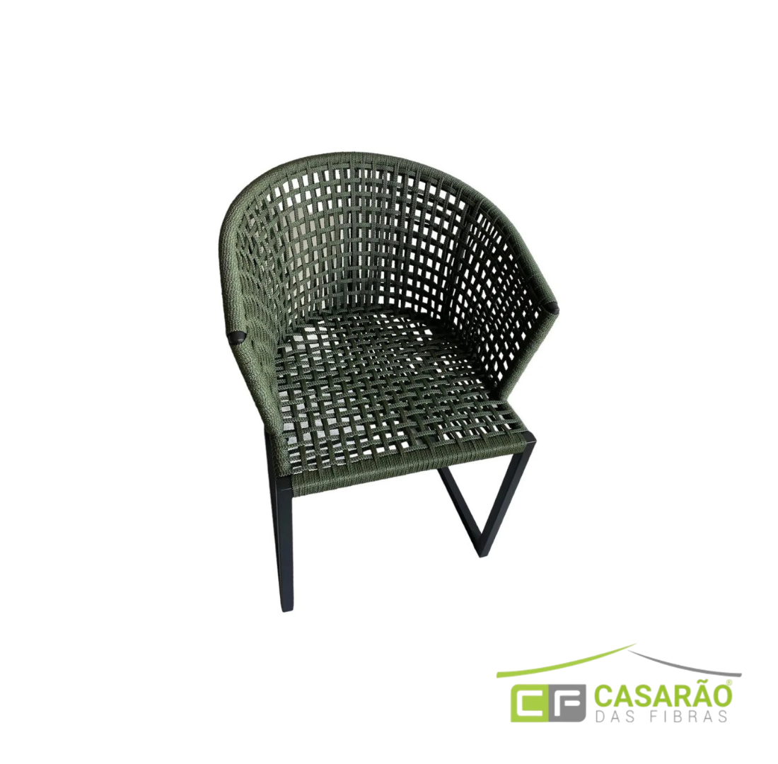 O grande diferencial da Verona está no padrão xadrez aberto de malha regular em corda náutica verde militar no encosto semicircular e no assento. Artesãos especializados da Casarão das Fibras entrelaçam à mão cada corda em ângulos perpendiculares com espaçamento uniforme, criando uma malha geométrica precisa e de grande leveza visual. Além disso, o verde militar é uma tonalidade rica e versátil que dialoga com jardins, ambientes tropicais e projetos de decoração contemporânea. De fato, a continuidade do mesmo padrão entre encosto e assento reforça a coesão visual da peça. Por isso, a Verona se destaca como cadeira de design autoral em qualquer ambiente externo sofisticado.