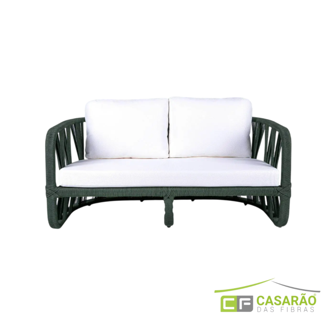 O sofá em corda náutica para área externa Noronha é uma peça de dois lugares que celebra o artesanato náutico em cada detalhe. Ele apresenta estrutura tubular totalmente revestida em corda verde musgo, laterais com padrão vertical aberto e nós decorativos amarrados nas junções, além de almofadas de assento e encosto off-white removíveis. Em resumo, é a escolha perfeita para quem quer um sofá externo com identidade tropical, artesanato expressivo e contraste elegante entre o verde e o branco em jardins e áreas externas de alto padrão.