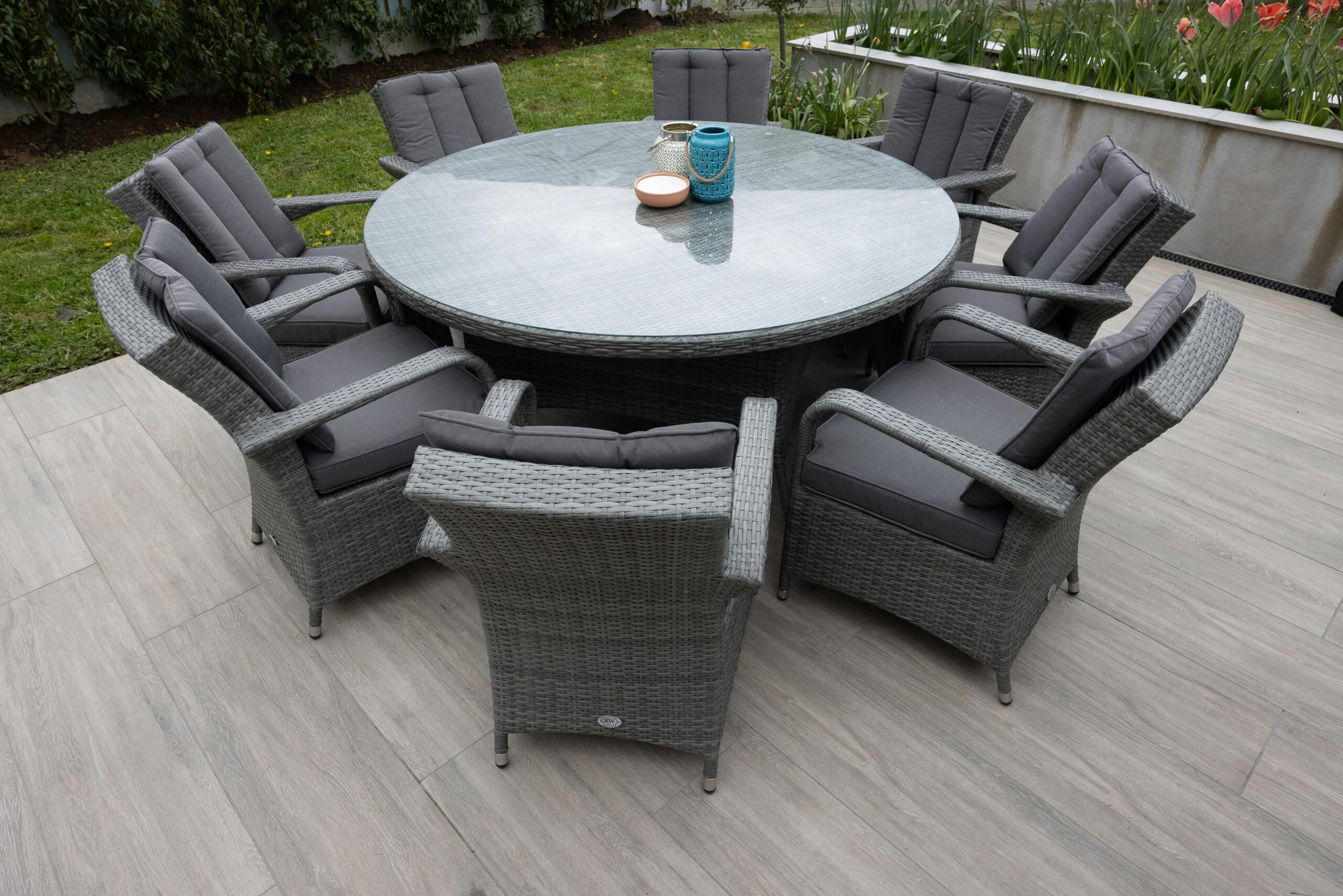 A cadeira Aneci tem estrutura em alumínio com pintura eletrostática e fibra sintética trançada à mão. Além disso, as almofadas em tecido acquablock garantem conforto e resistência à umidade sem exigir manutenção especial. Por isso, é um modelo que funciona bem tanto em jardins residenciais quanto em áreas de lazer mais amplas.