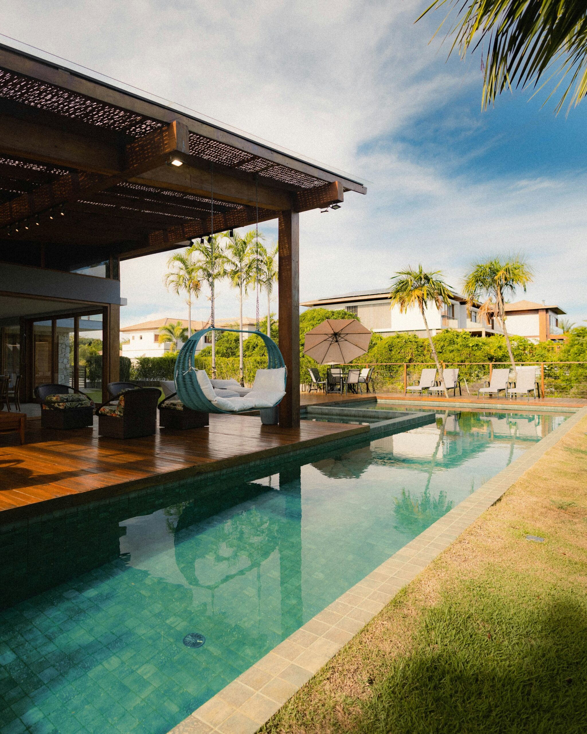 Além disso, o conjunto dialoga com o deck em madeira nobre e o pergolado de bambu. A cadeira balanço suspensa e as redes artesanais entram na composição com naturalidade. Juntos, esses elementos formam uma área de lazer com personalidade e acabamento premium.
